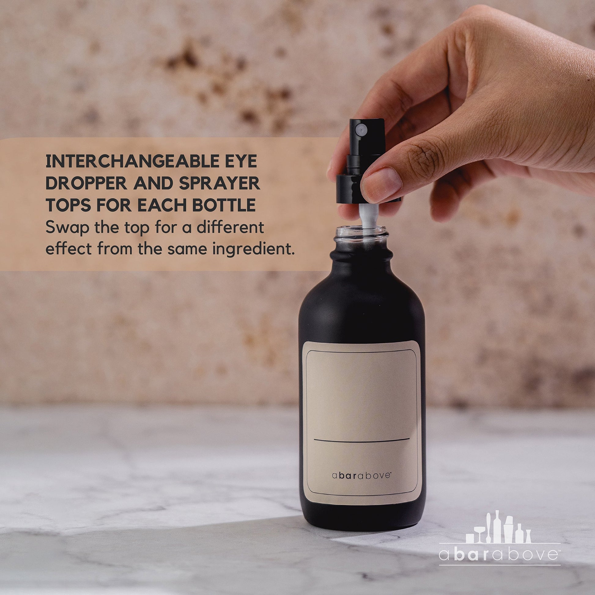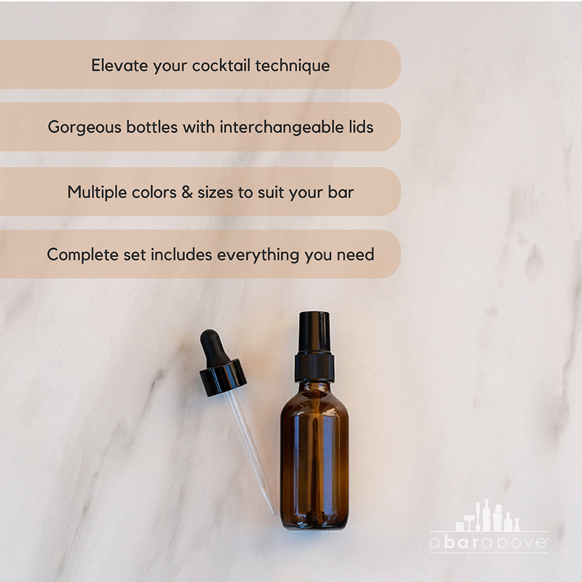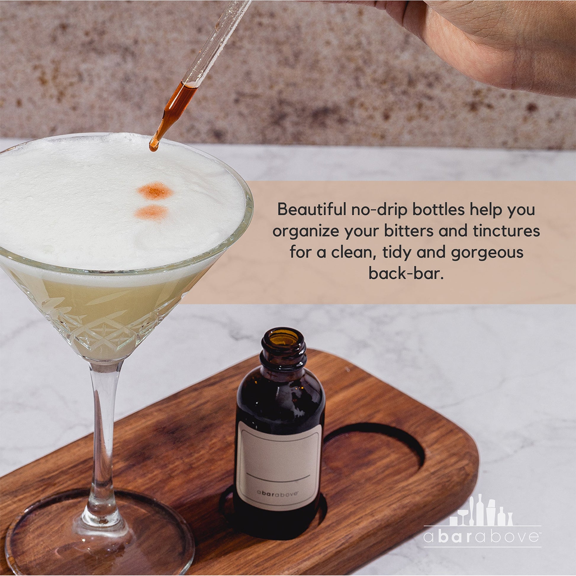 - Beautify your back bar. Choose from exclusive matte black or classic amber brown bottles to organize your bitters and tinctures for a clean and coordinated look.