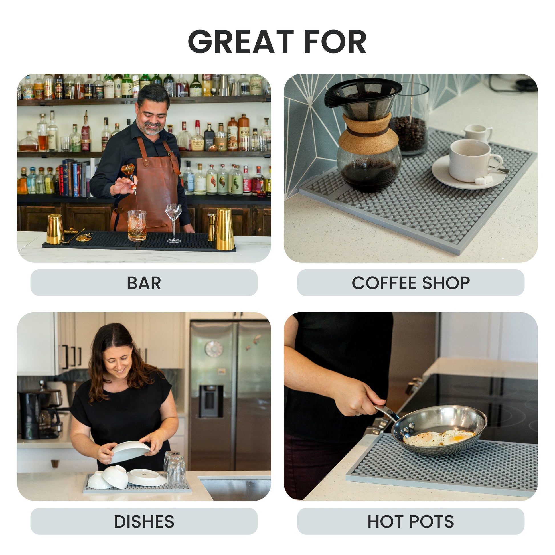 - Versatile:Â Beefy enough for the busiest bar but durable and flexible enough for home use, these mats make great home bar mats and also work perfectly as a dish drying tray for the kitchen.